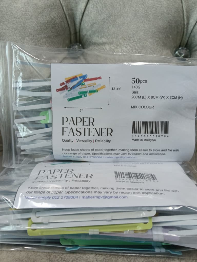 A “mixed colour paper fastener” is a stationery item, usually plastic, featuring a set of prongs and a compressor in various bright colours (like red, blue, green, yellow, pink, white) bundled together for color-coding and organizing multiple sheets of paper without staples, offering strong grip for filing and projects.